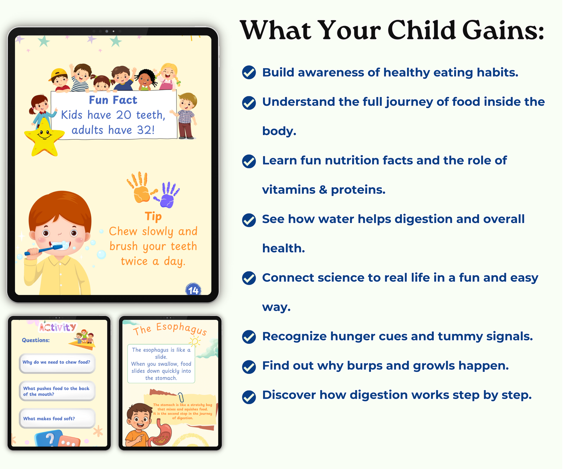 Imagine your child excitedly explaining how their tummy works, choosing healthy snacks like a nutrition pro, or marveling at the science behind a simple bite of food. This eBook isn't just about biology—it's about transforming mealtime into a thrilling expedition through the human body!