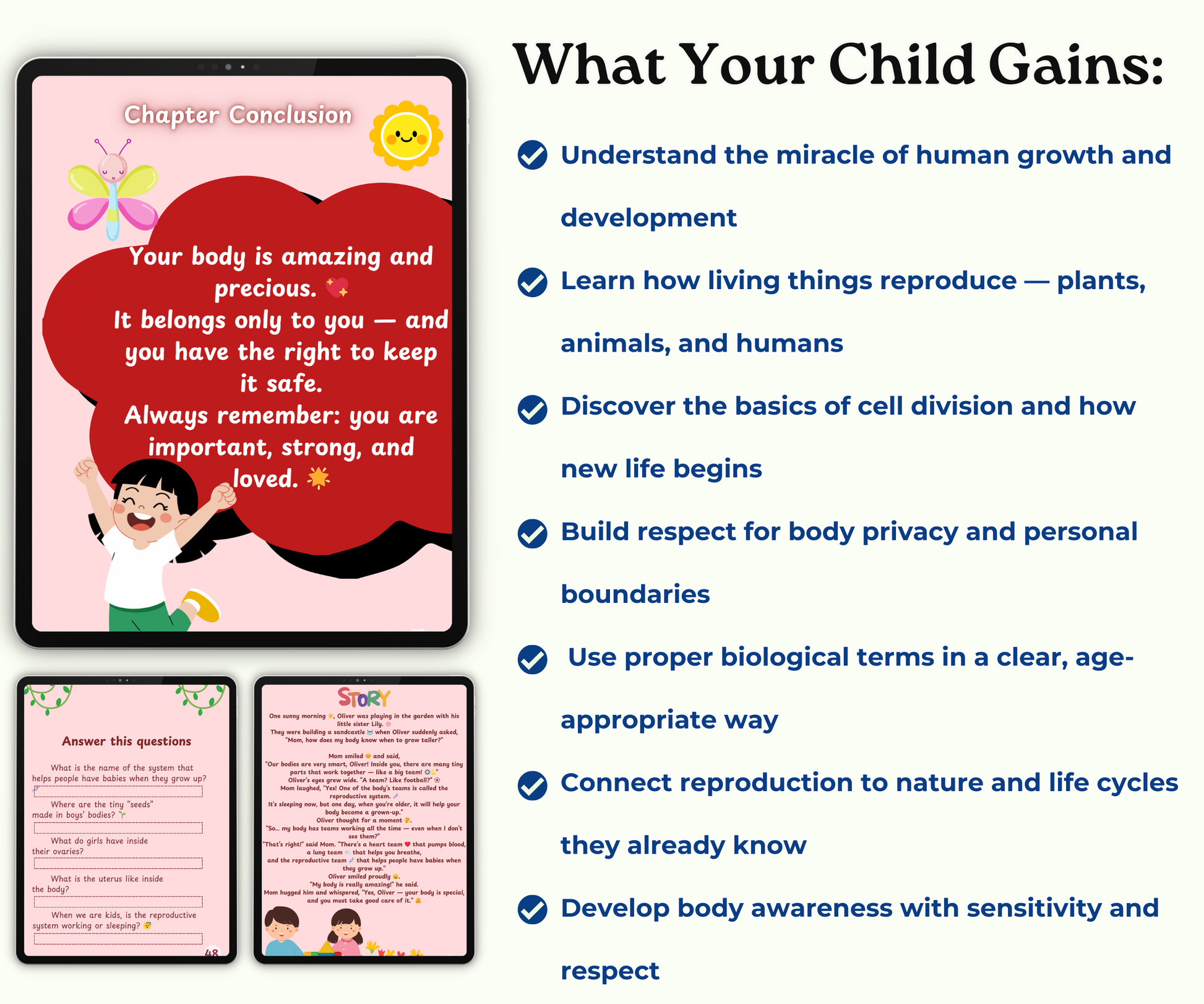 We understand that discussing the reproductive system requires sensitivity and care. This eBook is designed to help you introduce this important topic in an age-appropriate, respectful way that satisfies natural childhood curiosity while maintaining the wonder and dignity of human development.